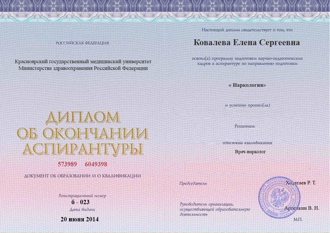 - Переподготовка и повышение квалификации в Красноярском государственном медицинском университете по направлению лечения зависимостей от химических веществ.